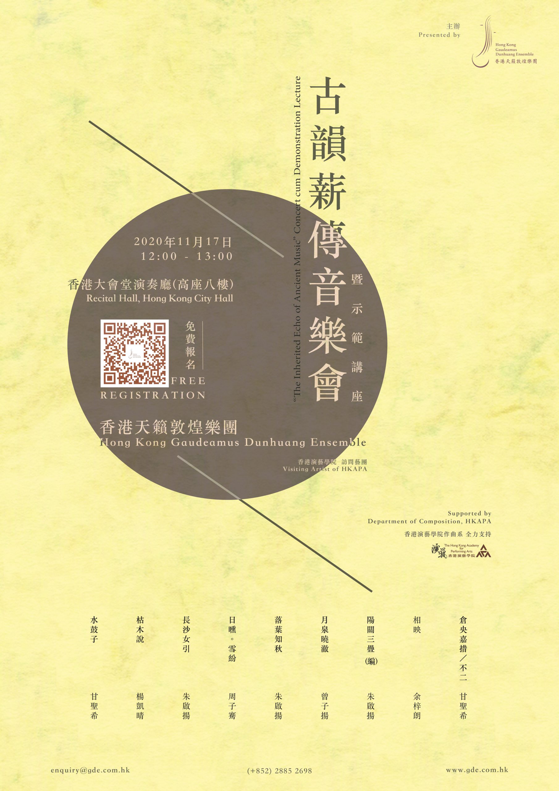 由香港天籟敦煌樂團主辦的《古韻薪傳》音樂會暨示範講座及兩場專題座談圓滿結束。樂團著重教育並鼓勵本地藝術創作,與香港演藝學院作曲系合作舉辦這場音樂會,致力培育本地音樂人。樂團特意委約作曲系的兩名在讀生與兩名畢業生,為四件古樂器 (分別是唐代笙、曲項琵琶、箜篌和塤) 創作四首新音樂,分別是《日矄.雪紛》、《月泉曉澈》、《枯木說》及《相映》。